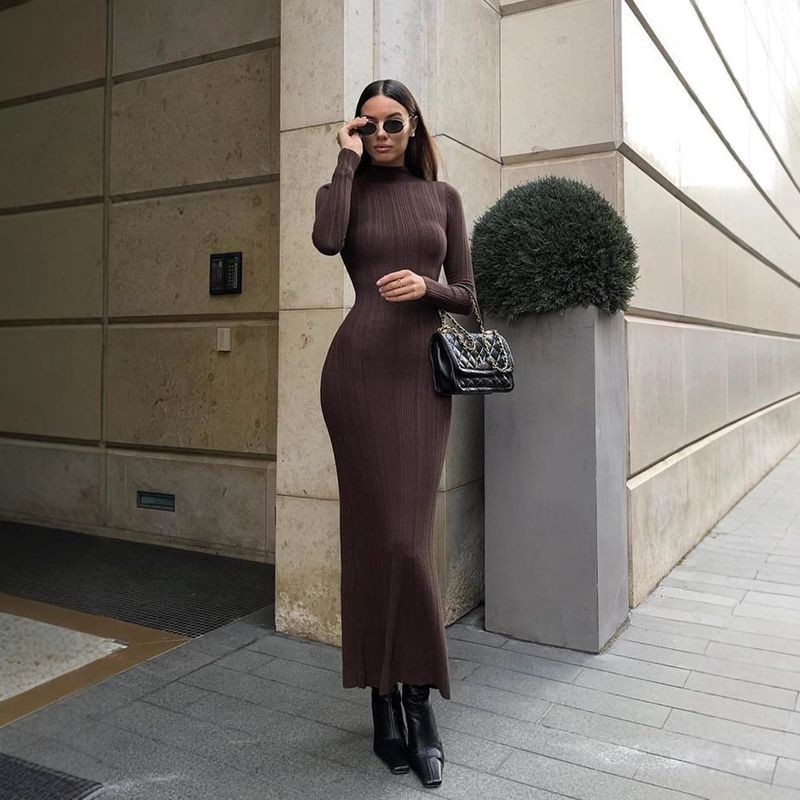 2024 Autumn Winter Long Sleeve Knitted Dress High Neck Tight French Elegant Base Striped Sweater Dress