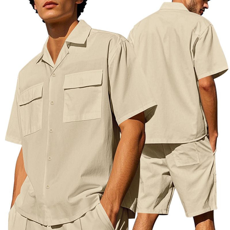 American summer thin men's loose casual Hawaiian light luxury workwear short sleeved shirt shorts set for men