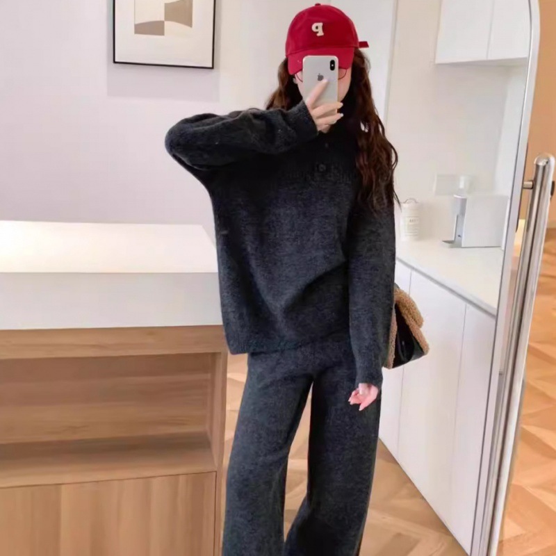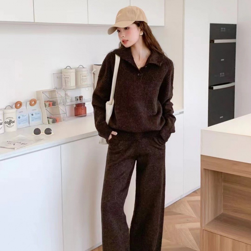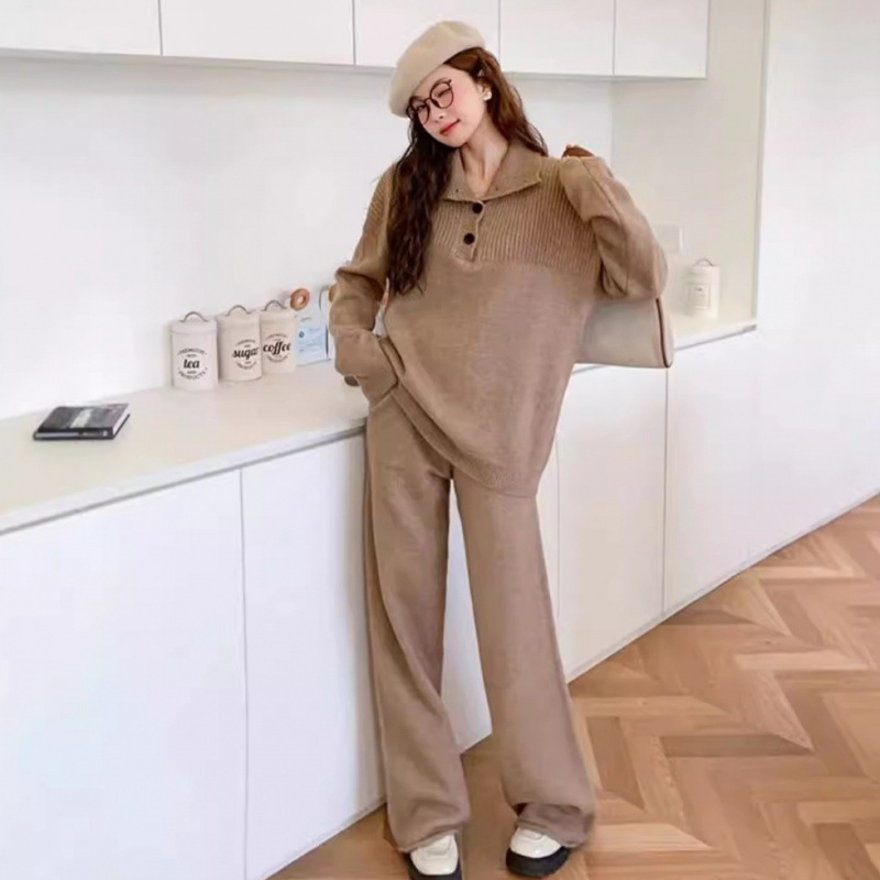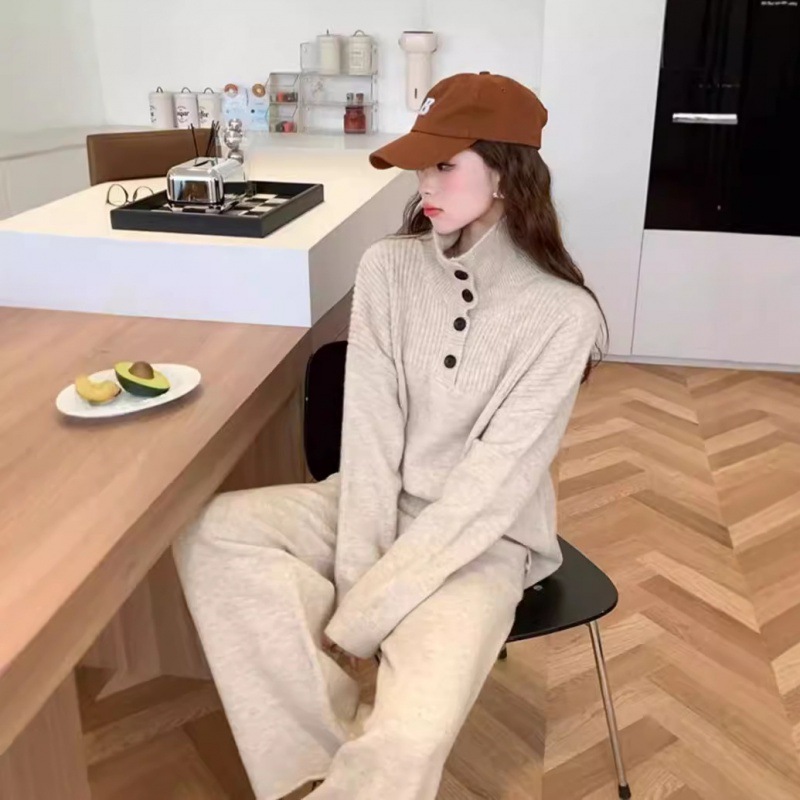 Herbst und Winter neuer Anzug lässiger Pullover Polokragen Strickpullover weite Beinhose zweiteiliges Set für Damen