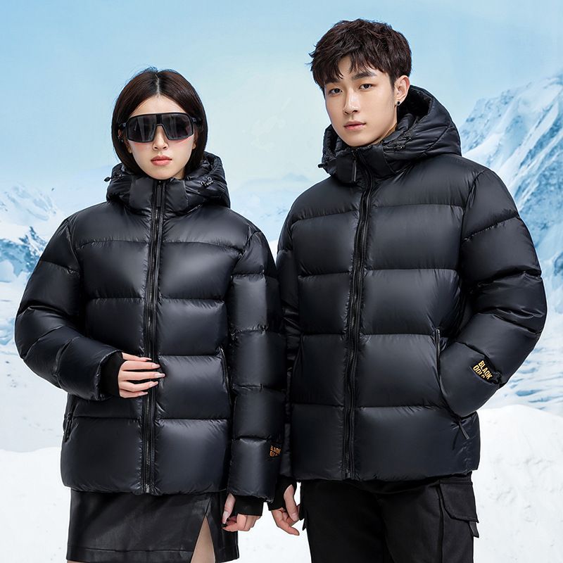 Black Gold Label Kurzer Mantel mit Kapuze aus Gänsedaunen im Paarstil, glänzend, verdickt, warm, für den Außenbereich, Pufferjacke, Großhandel