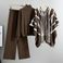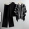 Damenbekleidung, elegante Dame, lässiger Stil, Strickpullover, Schal, Umhang, Hose mit weitem Bein, dreiteiliger Anzug