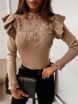Damenbekleidung im heißen Stil mit langen Ärmeln, Rundhalsausschnitt und Spitzenverzierung, einfarbiges T-Shirt für Damen