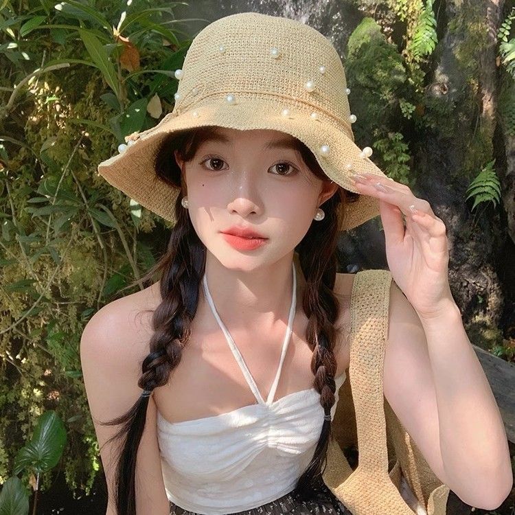 Purely Handmade Raffia Pearl Straw Hat for Women, Sweet and Versatile Summer Sunshade Fisherman Hat for Beach Vacation
