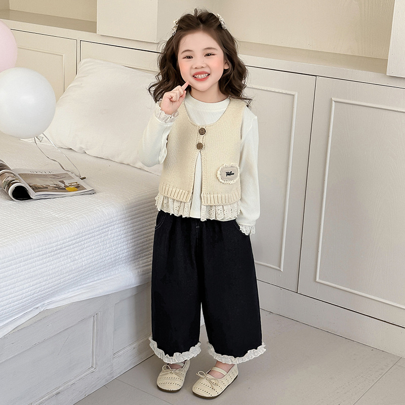 Dreiteiliges Strickwesten-Set für Mädchen, Herbst 2025, neue koreanische Kindermode, Strickweste und weite Hose