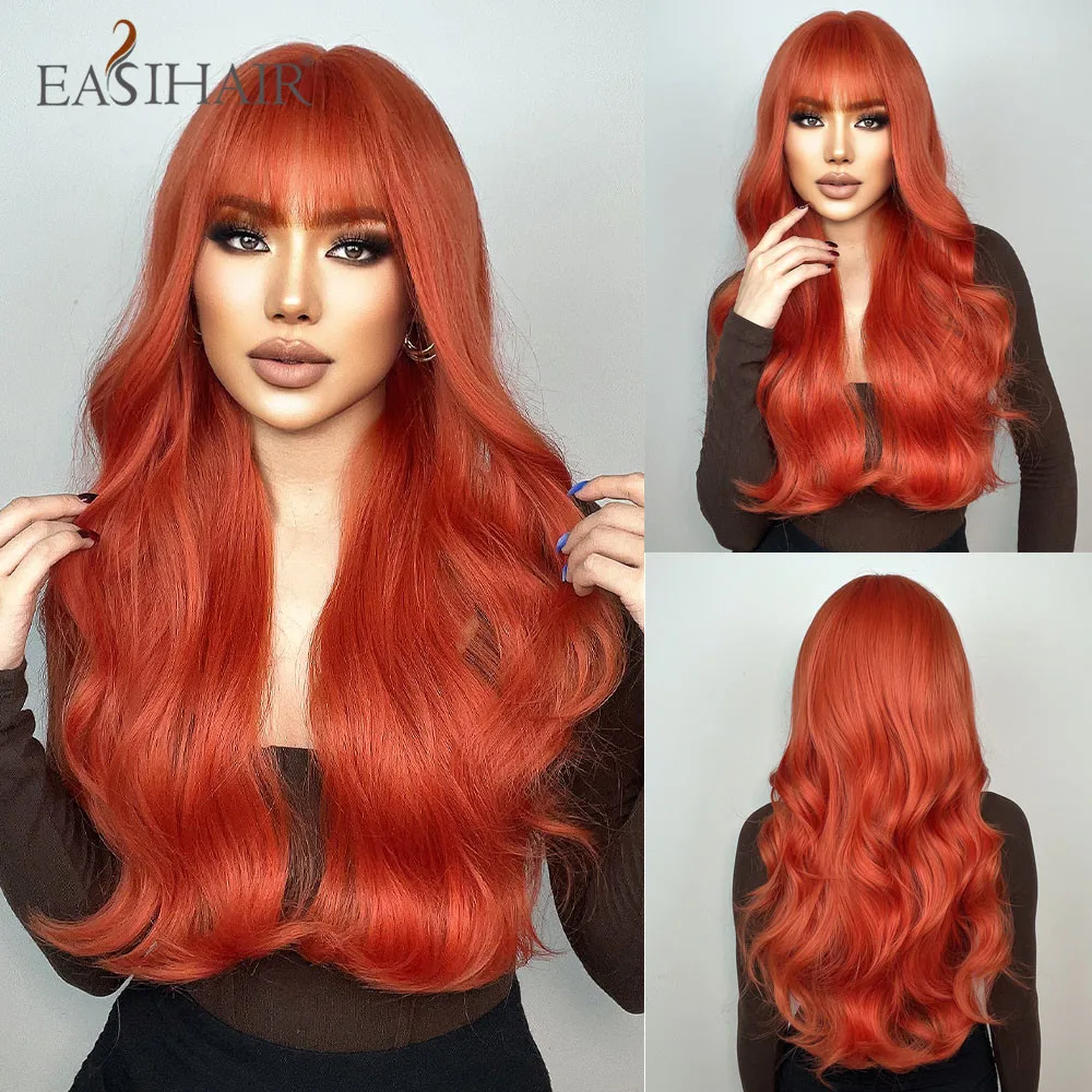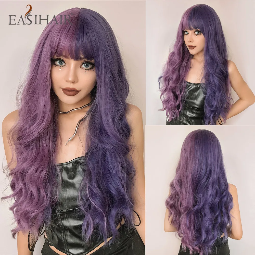 EASIHAIR Purple Long Wavy Synthetic Wigs with Bangs for Women Colorful Cosplay Party Halloween Hair Wig Heat Resistant Fibre