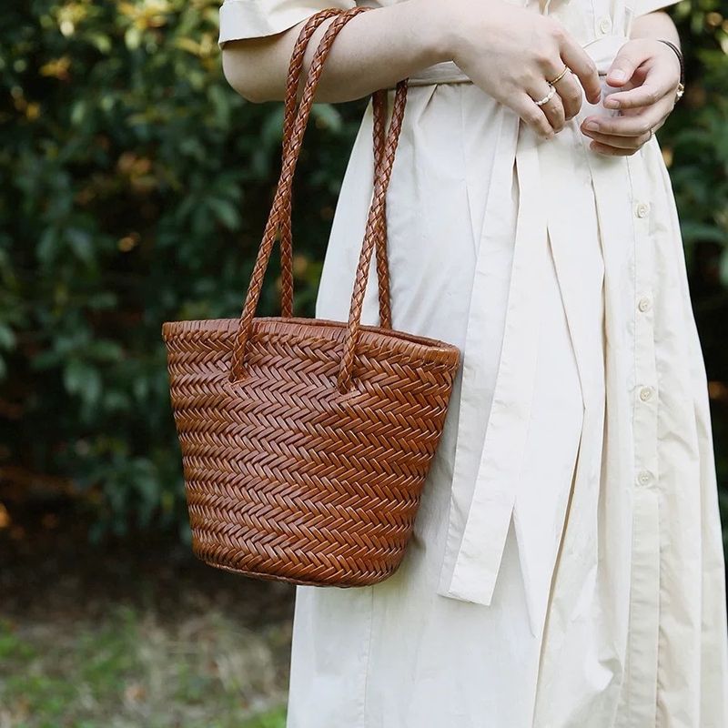 French Genuine Leather Woven Bag 2025 Single Shoulder Bucket Bag Basket Bag Niche Design Beach Vacation Bag