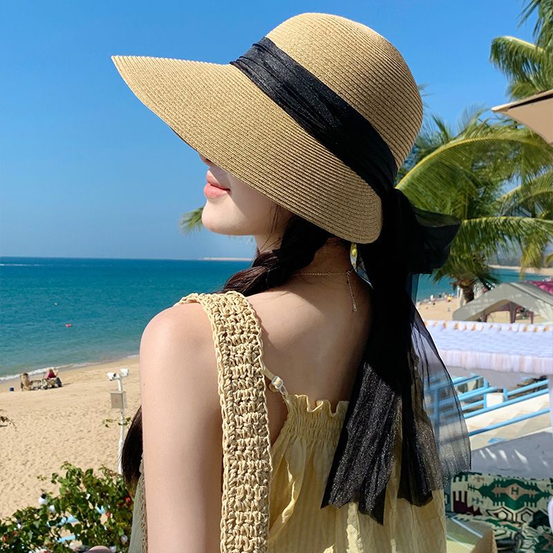 French lace lace lace up big brimmed straw hat for women's summer travel, beach hat for sun protection and shade, fisherman hat trendy