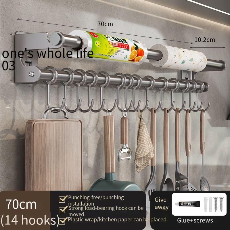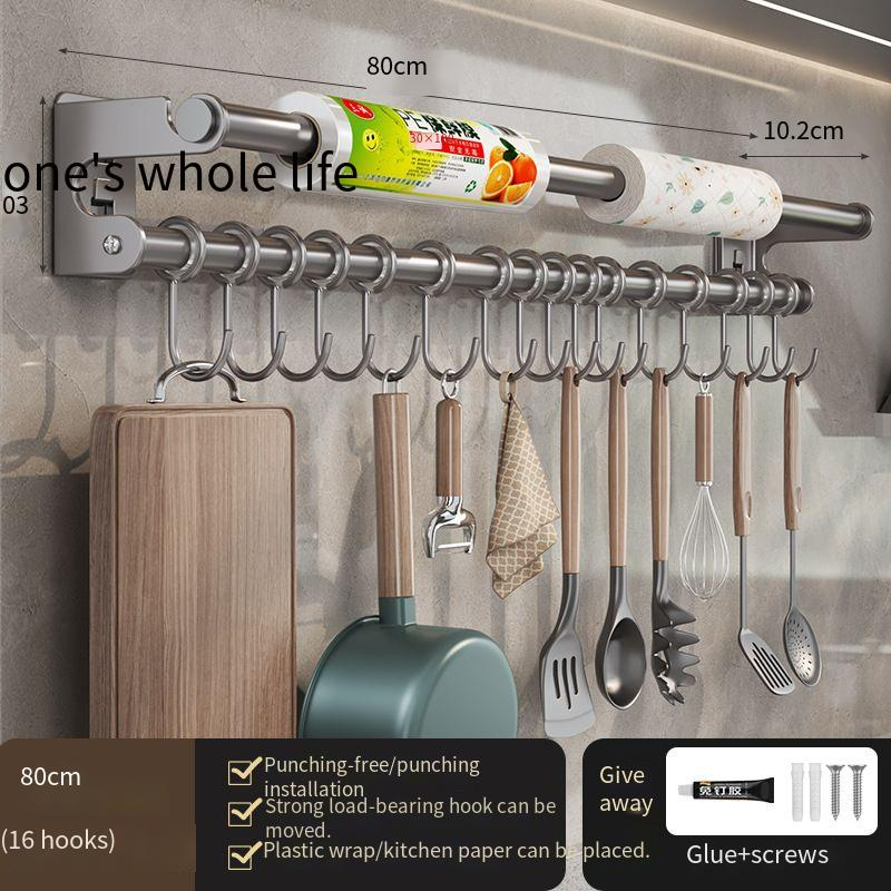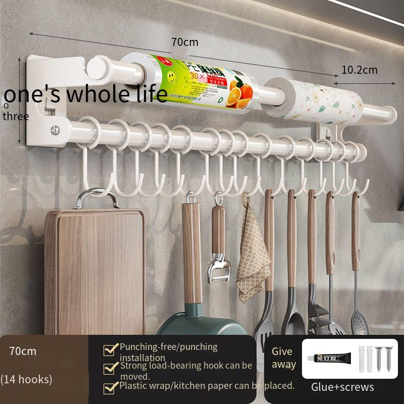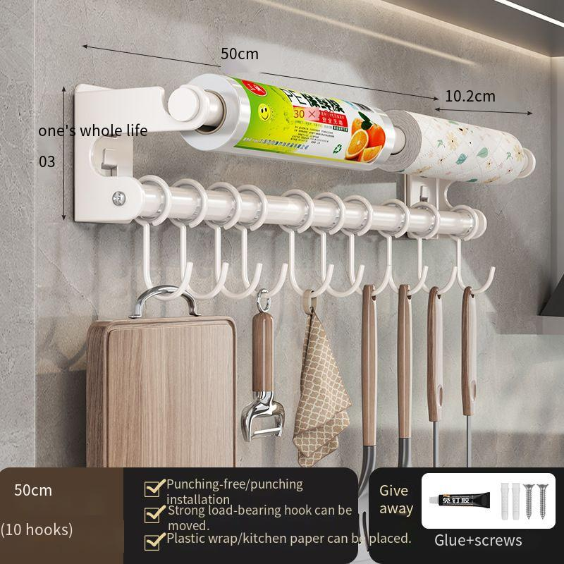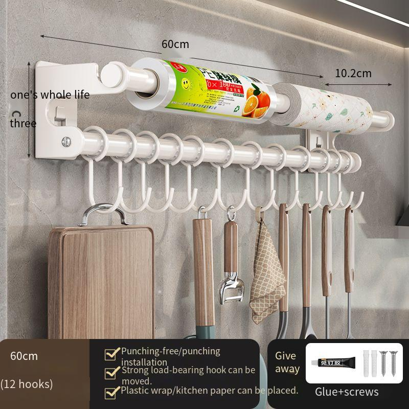 White Kitchen Hook No-Drill Wall-Mounted Hanging Rod Storage Rack Kitchen Utensils Spoon Spatula Organizer Rack