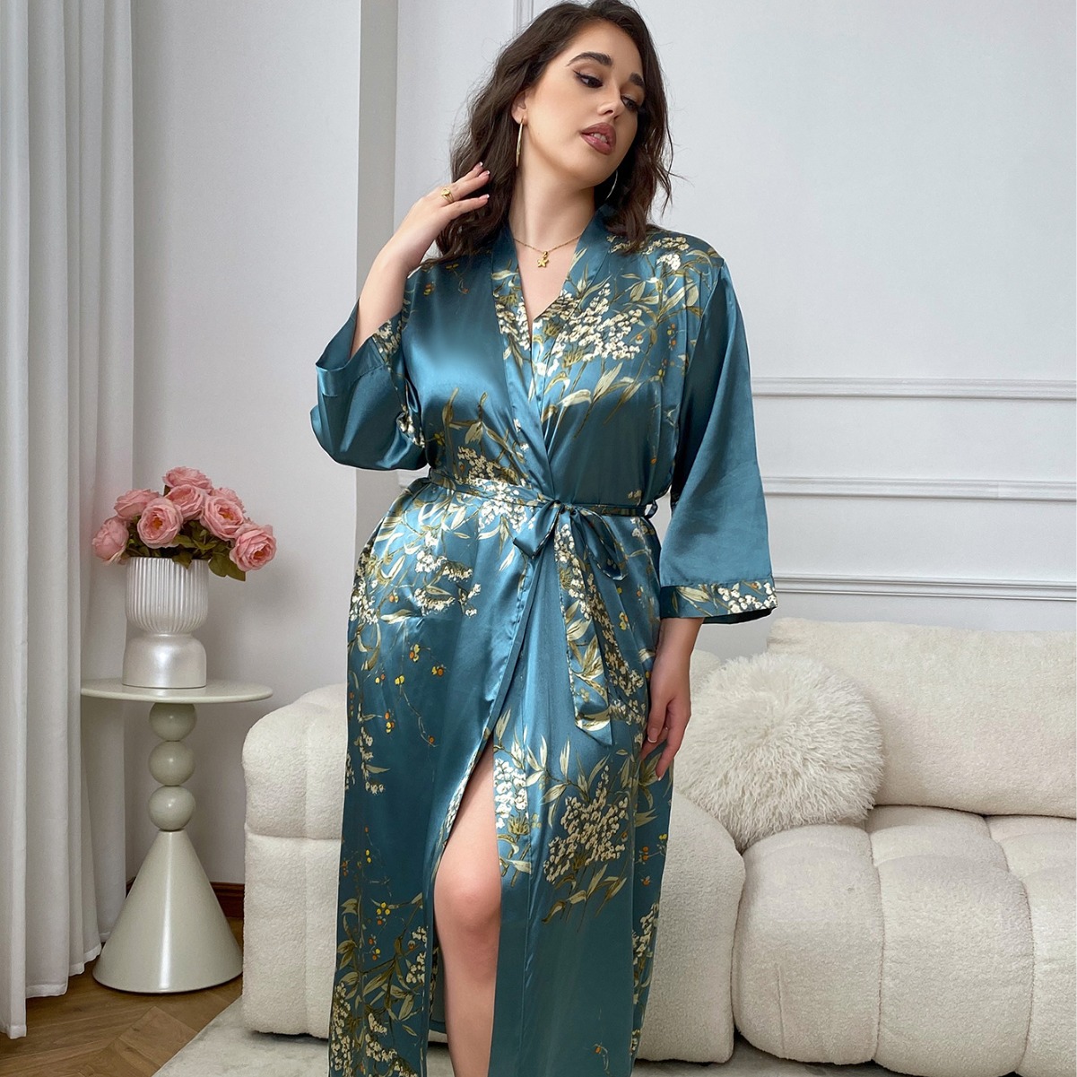 GraceChic Cross-Border Plus Size Damen-Nachthemd mit Blumenmuster aus Satin, lässig, bequem, locker und atmungsaktiv