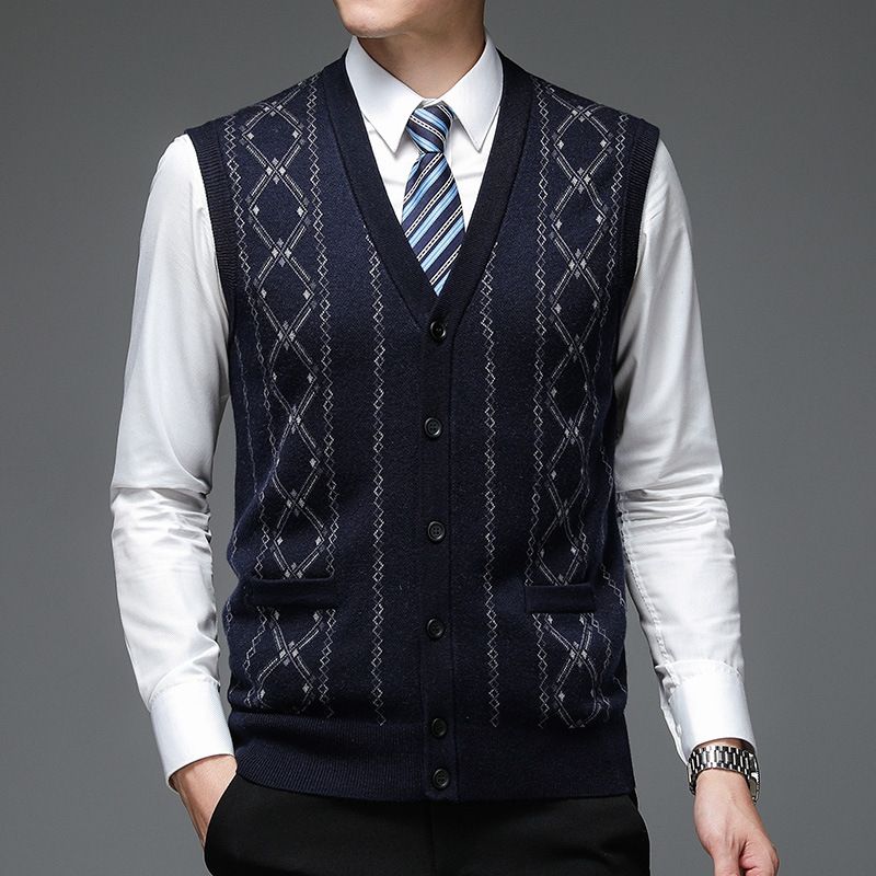 Autumn Winter Navy Blue Single-Breasted Casual Hoodless Wool Slim Fit Collarless Plaid Wool Vest Men's Waistcoat