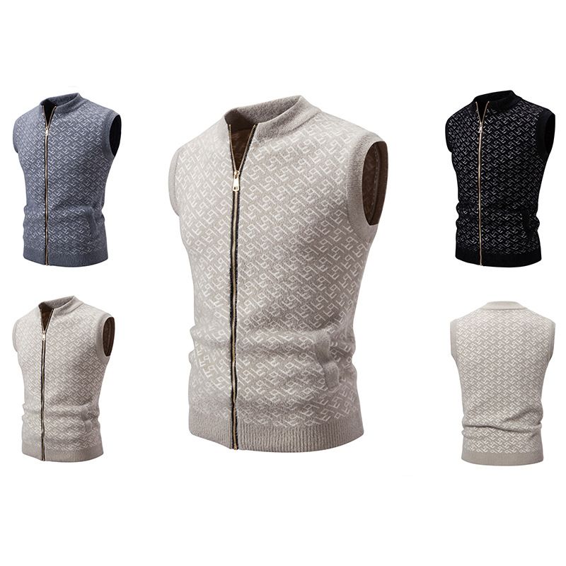 Men's Vest Autumn Winter New Round Neck Cardigan Fashion Printed Zipper Sweater Knitted Vest