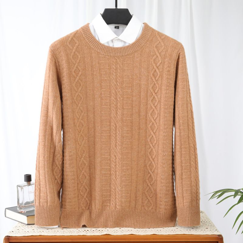 Cashmere sweater men's round neck 100% pure cashmere autumn and winter new style long sleeved pullover double stranded thick twisted flower knitted sweater