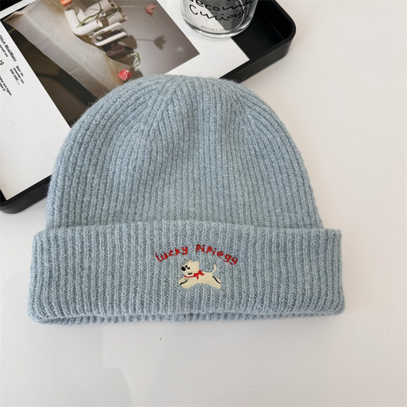 Korean Cute Dog Embroidered Knitted Hat for Girls in Autumn and Winter to Keep Warm, Show off Face, Small Ear Protector, Knitted Hat Versatile, Cold Hat for Men