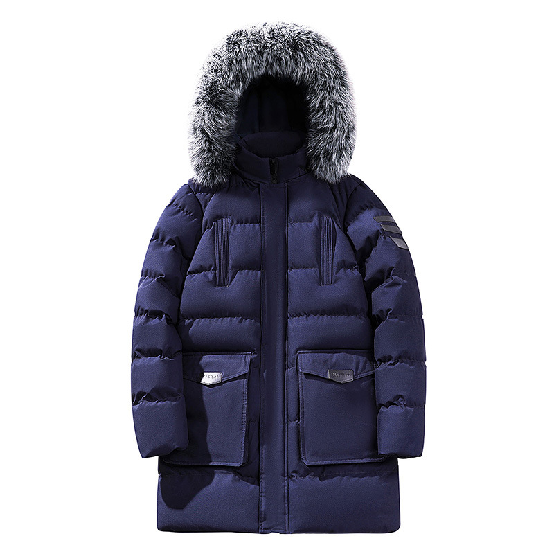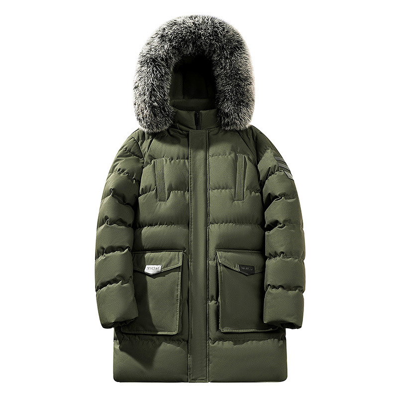 Große, mit Baumwolle gefütterte Jacke für Herren mit abnehmbarer Kapuze und großem Pelzkragen.