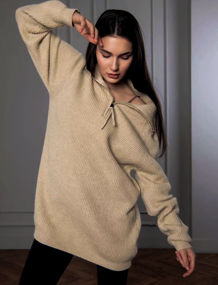 Lockerer, übergroßer Strickpullover mit halblangem Revers und kontrastierendem Streifenmuster für Damen