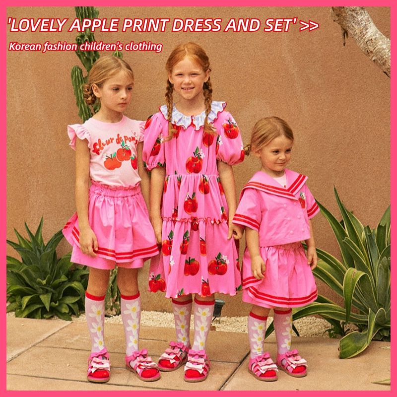 Mädchen Sommerkleid 2024 Neues koreanisches Kinder-Set mit Apfel-Print, kurzärmeliges Baumwolloberteil und Hose