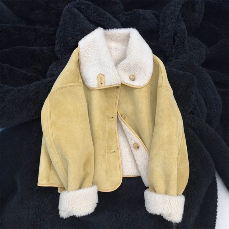 Mädchen Wildlederjacke mit Schaffellkragen, Schafwolle-Baumwoll-Mischgewebe, Winterjacke für Damen, neuer warmer, doppelseitiger, dicker Fleecemantel