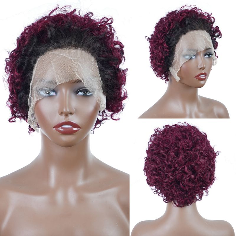 Pixie-Kurzbob-Perücken, 100 % Echthaar für Frauen, 1B 99j, weinfarben, kurzer Bob, lockige Perücke