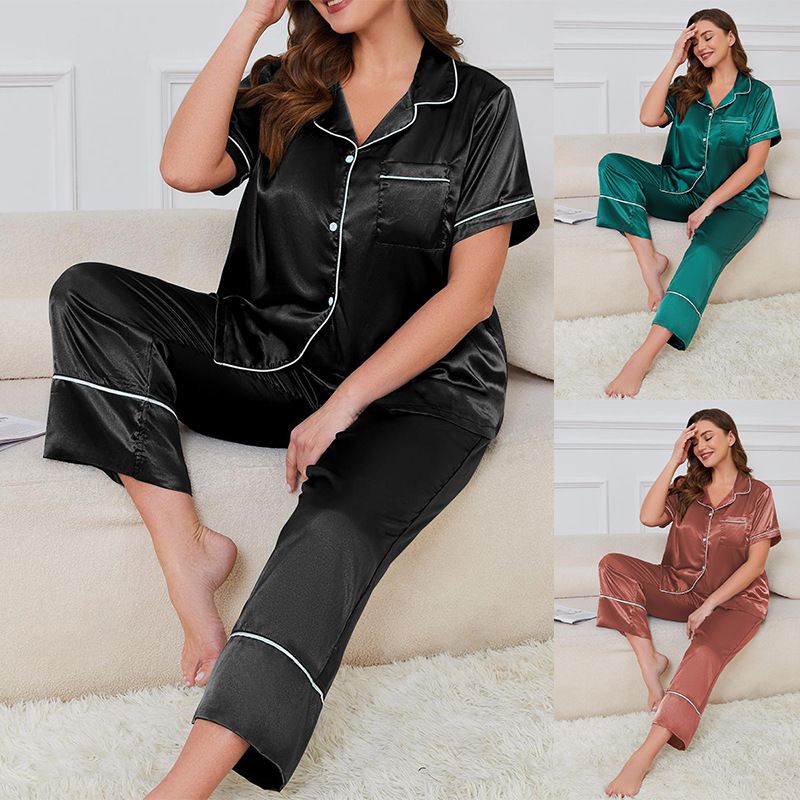 Plus Size Pyjamas Damen Sommer Casual Casual Simulierte Seide Kurzarmhemd Lange Hosen Home Wear Zweiteiliges Set