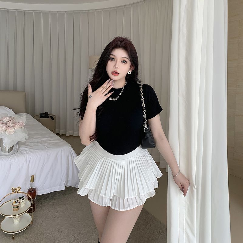 Plus Size Set aus schwarzem T-Shirt-Oberteil und hoch tailliertem Schlankheitsrock für leicht mollige Mädchen