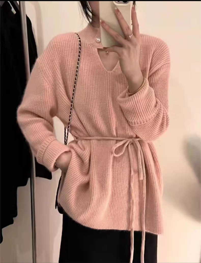 Sexy and careful machine hollowed out sweater for women, new Korean style temperament, high-end feeling, lace up waist cinching bottom knit top, trendy