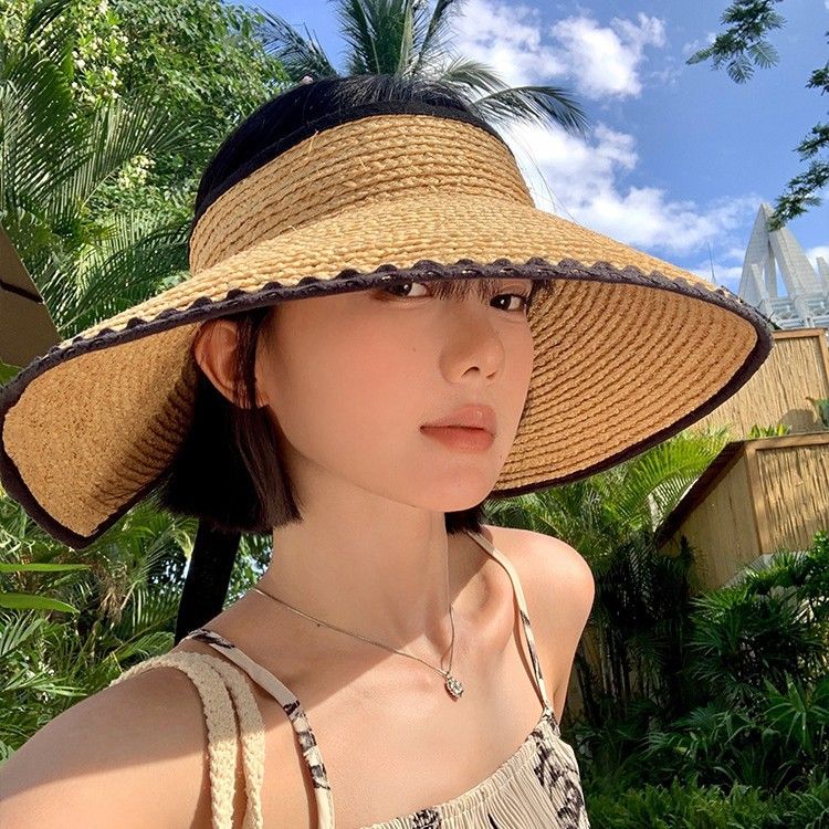 Raffia Straw Visor Hat with Wide Brim, Full Face Sun Protection Straw Hat for Women, Summer Travel Sun Hat, Rollable and Packable