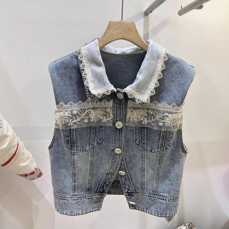 Lace patchwork denim vest, women's spring new style, fashionable design, casual vest, shoulder strap
