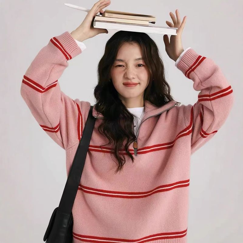 Wool Sweater Korean Style Striped Half-Zip Polo Collar Sweater for Women 2024 New Loose Lazy Knitted Top