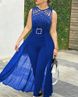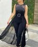 Schwarzer ärmelloser Jumpsuit mit Riemen und heißem Rautendesign an der Taille aus Mesh